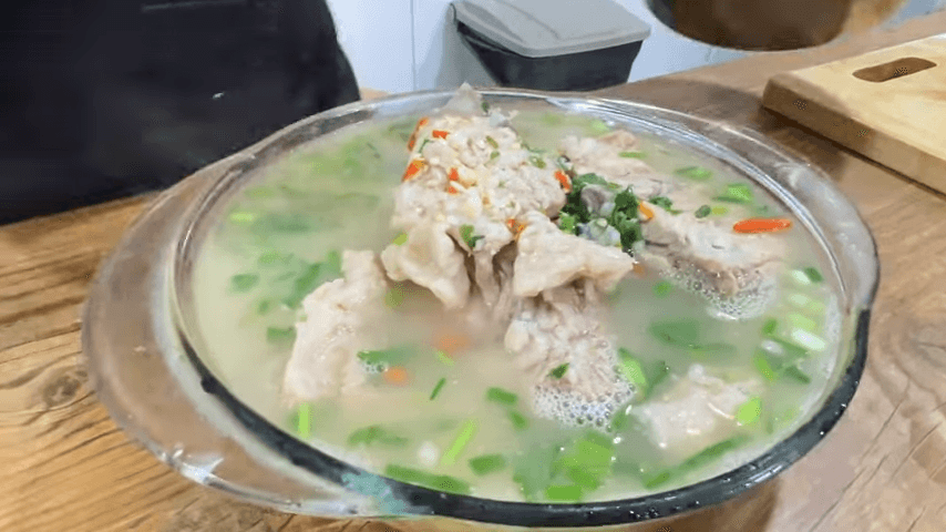 ตักกระดูกเล้งใส่หม้อเล็ก (ประมาณ 4-5 ชิ้น) เติมน้ำซุป และตั้งไฟให้เดือด