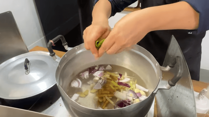 1. ต้มสมุนไพรให้หอม: ตั้งหม้อใส่น้ำสะอาด รอจนน้ำเดือด ใส่เกลือลงไปเล็กน้อย จากนั้นใส่เครื่องสมุนไพรทั้งหมดลงไปค่ะ (หอมแดง, กระเทียม, กระชาย, ตะไคร้, ใบมะกรูด, พริกแห้ง) ต้มทิ้งไว้ประมาณ 20 นาที หรือจนกว่าสมุนไพรจะนุ่มค่ะ