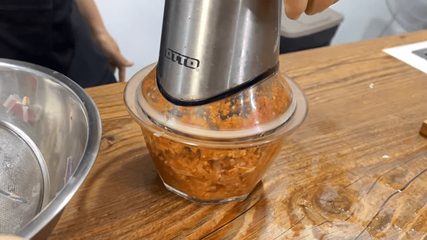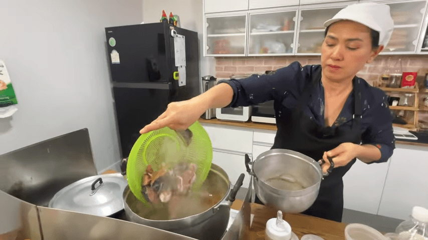 2. ปั่นเครื่องแกง: พอต้มจนได้ที่ ให้ตักเฉพาะเนื้อสมุนไพรขึ้นมาพักไว้ (น้ำต้มอย่าเพิ่งทิ้งนะคะ เก็บไว้ทำน้ำแกงต่อ) นำสมุนไพรไปปั่นให้ละเอียด เติมน้ำต้มสมุนไพรลงไปในโถปั่นนิดหน่อยจะได้ปั่นง่ายขึ้นค่ะ เคล็ดลับ: ใครชอบน้ำแกงสีเขียวสวย ไม่ต้องปั่นใบมะกรูดรวมนะคะ ให้ใส่ใบสดตอนท้ายแทน