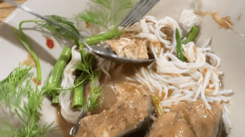 วิธีรับประทาน ตักขนมจีนใส่จาน ราดด้วยน้ำยาหม้อปลาร้าร้อนๆ ตักเนื้อปลาชิ้นโตๆ ใส่ลงไป กินคู่กับผักสดอย่างผักชีลาวเข้ากันดีมากๆ ค่ะ รสชาติจะออกเค็มๆ นัวๆ เผ็ดกำลังดี ซดน้ำคล่องคอมาก